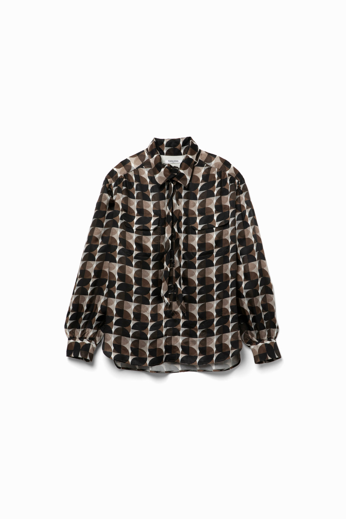 キュプラ生地にスクリーンプリントでジオメトリック柄を施したハイネックシャツ。
