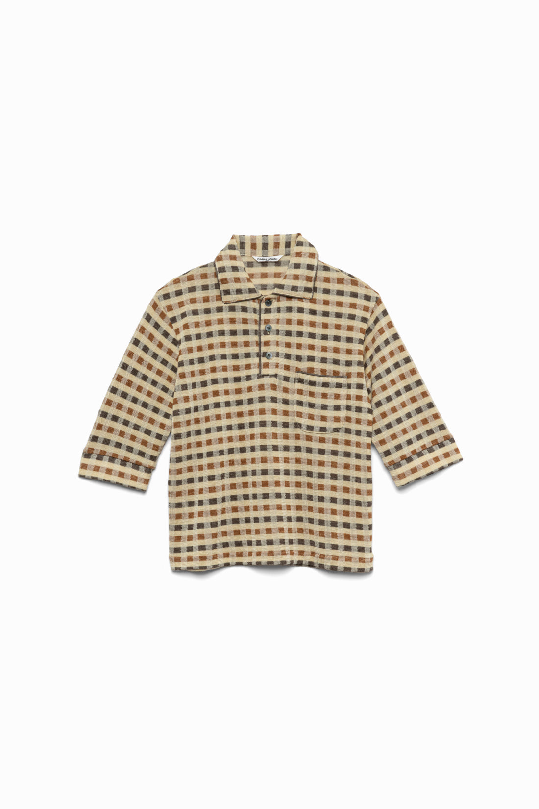 ウール、シルク、リネンの混紡糸にシルクをプレーティングしたチェック柄ニットポロ。