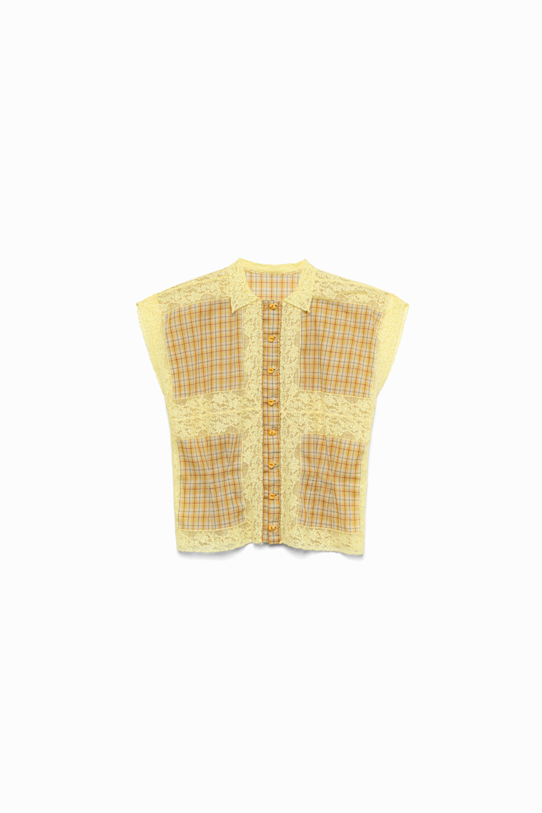 ムラ感のあるコットン⽷を強撚し、チェック柄に織り上げたボイル素材に、繊細なリバーレースを組み合わせたスリーブレスシャツ。