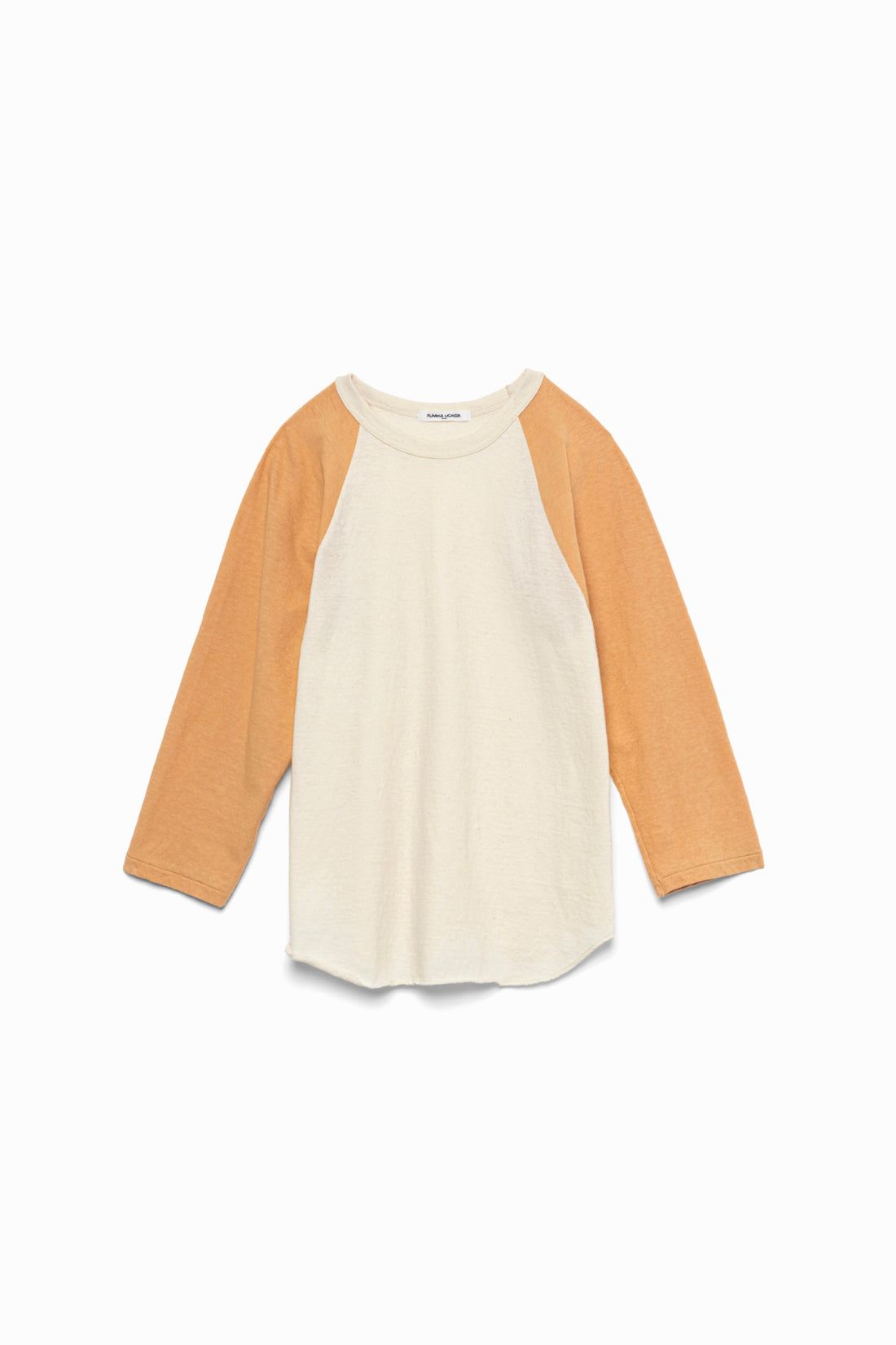 ムラ感のあるコットン⽷を丸胴で編み⽴てたコットンジャージーを使⽤した七部袖Tシャツ。